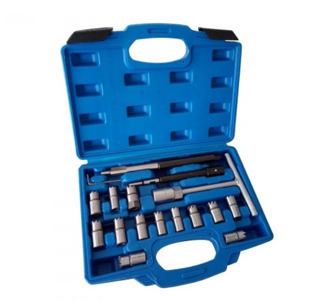 Комплектация: Комплектът съдържа 12 различни фрези с разнообразни размери за различни типове инжектори, както и необходимите адаптери и ключове за удобство при работа.