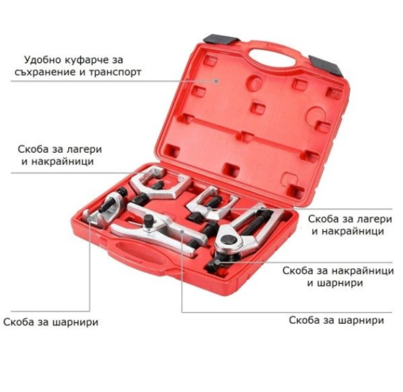 Подходящ за различни приложения: Комплектът включва инструменти за работа със скоби, които се използват при монтаж и демонтаж на шарнири, накрайници и лагери. Това го прави подходящ за широк спектър от автомобилни и индустриални задачи.