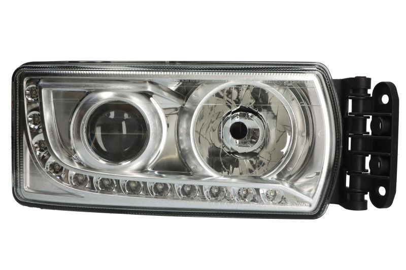 Този фар е предназначен за дясната страна на превозното средство и е оборудван с LED и H7/H7 основни крушки. Фарът предлага механично регулиране и е без мотор, като включва дневни светлини за допълнителна безопасност и видимост през деня. Проектиран е да осигури дълготрайна и ефективна работа.