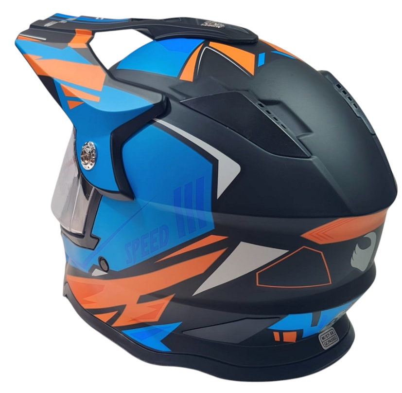 Крос каската модел No328 е създадена за любителите на мотокрос, ендуро и офроуд каране, които търсят стабилност, сигурност и стил. Съчетанието от матово черно и синьо придава спортна и агресивна визия, а здравата конструкция осигурява надеждна защита при всякакви терени.