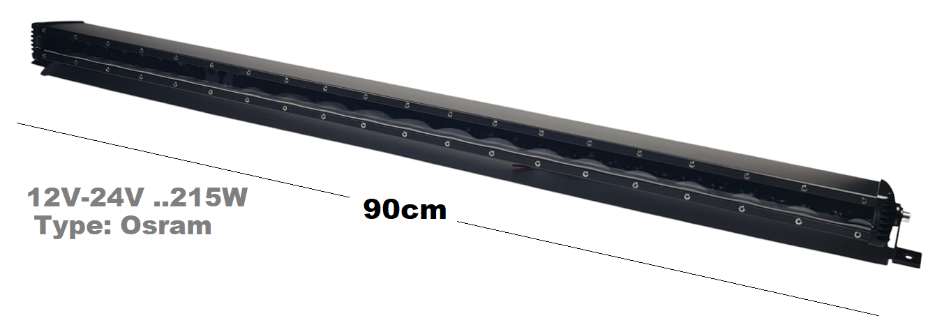 LED барът 90 см 215W тип Osram е мощно осветително решение, предназначено за превозни средства, които изискват висока осветеност в условия на тъмнина или при офроуд шофиране. С мощност от 215W и използването на висококачествени LED чипове от Osram, този LED бар осигурява отлична осветеност, дълъг живот и висока ефективност, което го прави идеален за автомобили, камиони, джипове и офроуд превозни средства.