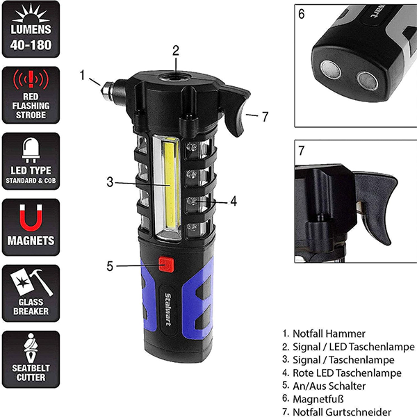 Многофункционален LED фенер: Включва бяла светлина, червена предупредителна светлина, COB работна светлина, авариен чук за безопасно счупване на прозорец и нож за колан, което я прави полезна във всякакви ситуации.